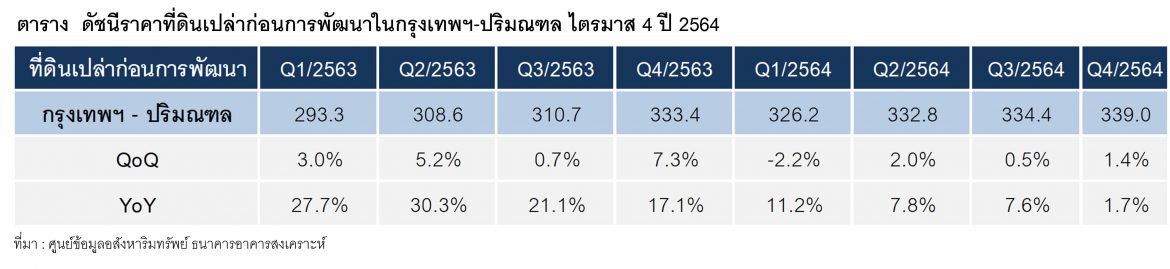 ศูนย์ข้อมูลอสังหาริมทรัพย์ ธนาคารอาคารสงเคราะห์ รายงานดัชนีราคาที่ดินเปล่าก่อนการพัฒนา ในกรุงเทพฯ-ปริมณฑล ไตรมาส 4 ปี 2564 มีค่าดัชนีเท่ากับ 339.0 จุด เพิ่มขึ้นร้อยละ 1.4 เมื่อเทียบกับไตรมาสก่อนหน้า (QoQ) และเพิ่มขึ้นเล็กน้อยเพียงร้อยละ 1.7 เมื่อเทียบกับช่วงเวลาเดียวกันของปีก่อน (YoY) ซึ่งแสดงให้เห็นว่าราคาที่ดินยังเพิ่มขึ้นอย่างต่อเนื่อง แม้ในช่วงภาวะเศรษฐกิจที่ชะลอตัว แต่เป็นการเพิ่มขึ้นในอัตราที่ชะลอตัวลงเป็นไตรมาสที่ 6 แล้ว นับตั้งแต่ไตรมาส 3 ปี 2563 ที่ผ่านมา หากดูค่าเฉลี่ยอัตราขยายตัวย้อนหลังไป 5 ปี ตั้งแต่ปี 2558 ถึงปี 2562 ก่อนเกิดวิกฤตการณ์แพร่ระบาดของไวรัส COVID-19 ดัชนีราคาที่ดินเปล่าในแต่ละไตรมาสเพิ่มขึ้นโดยมีค่าเฉลี่ยประมาณร้อยละ 14.8 ต่อไตรมาสเมื่อเทียบกับช่วงเวลาเดียวกันของปีก่อน (YoY) และเพิ่มขึ้นโดยเฉลี่ยประมาณร้อยละ 4.1 ต่อไตรมาสเมื่อเทียบกับไตรมาสก่อนหน้า (QoQ) แสดงว่าแม้ราคาที่ดินเปล่าฯ จะยังมีการเพิ่มขึ้น แต่เป็นการเพิ่มขึ้นในอัตราที่ลดลง ซึ่งน่าจะเป็นผลจากปัจจัยสำคัญหนึ่งคือ ความคืบหน้าของการก่อสร้างรถไฟฟ้าสายต่างๆ ที่ใกล้จะแล้วเสร็จในปี 2565