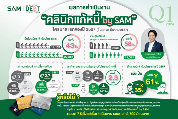 “คลินิกแก้หนี้ by SAM” ปิด Q1 สวย ชูคนไทยร่วมมือช่วยชาติลดหนี้ครัวเรือน ดันยอดใบสมัครไตรมาสแรกพุ่ง ย้ำสนองนโยบายรัฐช่วยเหลือลูกหนี้คงดอกเบี้ยต่ำ 3-5 % ผ่อนนานสุดถึง 10 ปี มั่นใจสิ้นปี 67 ทะลุเป้าหมาย 55,000 บัญชี