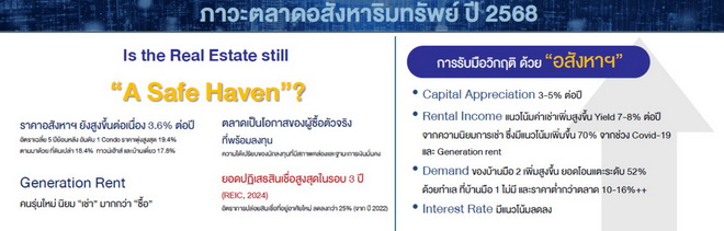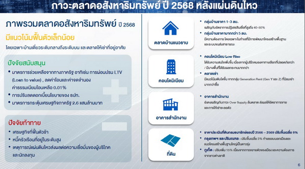 หลังเกิดแผ่นดินไหว ทำใหผู้บริโภคเกิดความเชื่อมั่นน้อยลง ส่งผลต่อโครงการตลาดคอนโดมิเนียมกระเภทโลไลฟ์เป็นที่ต้องการมากขึ้นสำหรับกลุ่มลูกค้าที่มองในเรื่องของความปลอดภัย รวมถึงยอดการปฎิเสธสินเชื่อบ้านแนวราบเพิ่มสูงขึ้นจาก 30 % เป็น40- 50 % ในกลุ่มที่อยุ่อาศัยราคาตต่ำกว่า 3 ล้านบาท ส่วนกลุ่มที่ยังไปได้คือกลุ่มราคา 5 ล้านบาท ที่อยู่ในทำเลที่เข้าออกสะดวก รวมถึงตลาดเช่าที่มีอัตราการเติบโตที่ดีขึ้น เนื่องจากลุ่ม Generation Rent (Gen Y และ Z) นิยมเช่ามากกว่าซื้อ อาคารสำนักงานยังคงเผชิญกับภาวะ over Supply ล้นตลาด ส่งผลให้อัตราการขายและการให้เช่าชะลอว