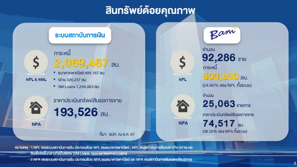 สำหรับภาพรวมหนี้ด้อยคุณภาพ NPL ในระบบสถาบันการเงิน (ธนาคารพาณิชย์ สถาบันการเงินเฉพาะกิจ และสินเชื่อจัดชั้นกล่าวถึงเป็นพิเศษ ) ณ สิ้นปี 2567 มีจำนวน 2,026,000 ล้านบาท และมีทรัพย์สินรอการขาย NPA (ธนาคารพาณิชย์และสถาบันการเงินเฉพาะกิจ) จำนวน 193,526 ล้านบาท ขณะที่ BAM มี NPL ในความดูแล ณ สิ้นปี 2567 จำนวน 503,603 ล้านบาท หรือคิดเป็น 24.86% ของระบบสถาบันเงิน รวมทั้งมี NPA จำนวน 74,517 ล้านบาท หรือคิดเป็น 38.50% ของระบบสถาบันการเงิน ทั้งนี้ BAM มีเป้าหมายในการเป็น Business Recycling Machine เพื่อช่วยพลิกฟื้นลูกหนี้ให้สามารถเดินหน้าธุรกิจต่อไปได้ รวมถึงสร้างการเติบโตของ BAM ให้แข็งแกร่กงด้วยแผนกลยุทธ์เชิงรุก “3P” ได้แก่ People, Partnerships, และ Platforms/Process เพื่อสร้างความเชื่อมั่นแก่ผู้ถือหุ้นและนักลงทุน