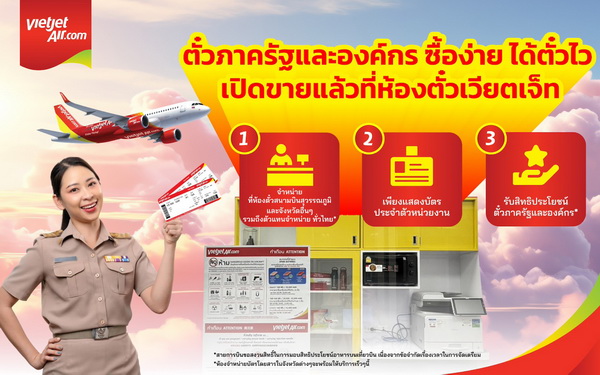 เวียตเจ็ทไทยแลนด์ เดินหน้าขยายแคมเปญพิเศษสำหรับผู้โดยสารภาครัฐและองค์กร ภายใต้แนวคิด ‘ซื้อง่าย ได้ตั๋วไว จองแล้วเดินทางได้เลย’ โดยเพิ่มช่องทางจัดจำหน่ายบัตรโดยสารที่ห้องจำหน่ายบัตรโดยสารของสายการบินฯ ณ ท่าอากาศยานสุวรรณภูมิ เพิ่มเติมจากที่ให้บริการผ่านตัวแทนจำหน่ายทั่วประเทศ บัตรโดยสารนี้ใช้สำหรับเดินทางบนเส้นทางบินภายในประเทศในราคาสุดคุ้ม เริ่มต้นเพียง 1,680 บาท (รวมภาษีและค่าธรรมเนียมต่อเที่ยวบิน) พร้อมสิทธิประโยชน์ต่าง ๆ อาทิ น้ำหนักสัมภาระเช็คอิน และห้องบริการรับรอง* เพื่ออำนวยความสะดวกในการเดินทางไปปฏิบัติหน้าที่และทำงานได้อย่างสะดวกรวดเร็ว ด้วยราคาที่เข้าถึงได้ ซึ่งจะเริ่มจำหน่ายตั้งแต่วันที่ 2 มิถุนายน 2568 เป็นต้นไป