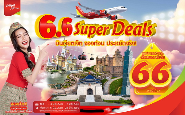 ดับเบิลเดย์ มิ.ย. นี้ คุ้มยิ่งกว่าที่เคย! เดินทางกับเวียตเจ็ทไทยแลนด์ ด้วยโปรโมชั่น ‘บินเวียตเจ็ทไทยแลนด์ จองก่อน ประหยัดจริง (6.6 Super Deals)’ เสนอบัตรโดยสารราคาพิเศษ เริ่มต้นเพียง 66 บาท (ไม่รวมภาษีและค่าธรรมเนียม) สำหรับเดินทางบนเครือข่ายเส้นทางบินภายในประเทศ อาทิ เชียงใหม่ ภูเก็ต หาดใหญ่ และอีกมากมาย รวมถึงสำหรับเส้นทางระหว่างประเทศของเวียตเจ็ทไทยแลนด์ อาทิ ไทเป ฟูกุโอกะ ฟูโกว๊ก ปักกิ่ง และเซี่ยงไฮ้ พร้อมด้วยอีกกว่า 10 เส้นทาง สามารถสำรองบัตรโดยสารได้ระหว่างวันที่ 4 – 7 มิถุนายน 2568 ใช้เดินทางได้ระหว่างวันที่ 16 มิถุนายน 2568 – 28 มีนาคม 2569 (ยกเว้นวันหยุดนักขัตฤกษ์) ที่ www.vietjetair.com ผู้โดยสารที่ต้องการเดินทางในช่วงเดือนกรกฎาคม – กันยายน มีที่นั่งราคาโปรฯ เพียบ จองได้เลยตอนนี้!