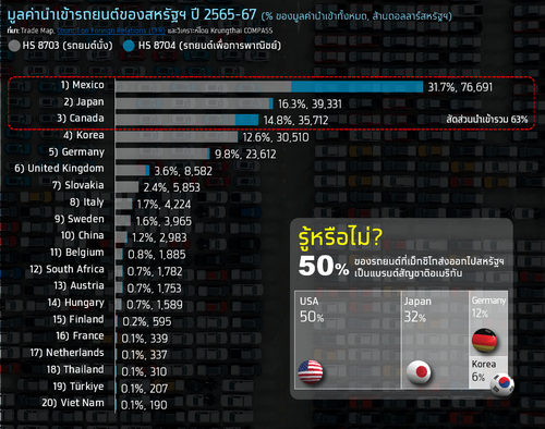 ในรอบปี 2565-67 สหรัฐฯ นำเข้ารถยนต์จากเม็กซิโก ญี่ปุ่น และแคนาดาสูงสุดเป็น 3 อันดับแรก คิดเป็นสัดส่วนสูงถึง 63% ของมูลค่านำเข้ารถยนต์ทั้งหมด แบ่งเป็นเม็กซิโก 7.7 หมื่นล้านดอลลาร์สหรัฐฯ (31.7%) ตามมาด้วยญี่ปุ่น 3.9 หมื่นล้านดอลลาร์สหรัฐฯ (16.3%) และแคนาดา 3.6 หมื่นล้านดอลลาร์สหรัฐฯ (14.8%)