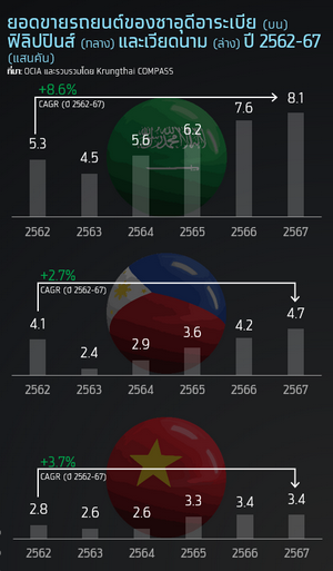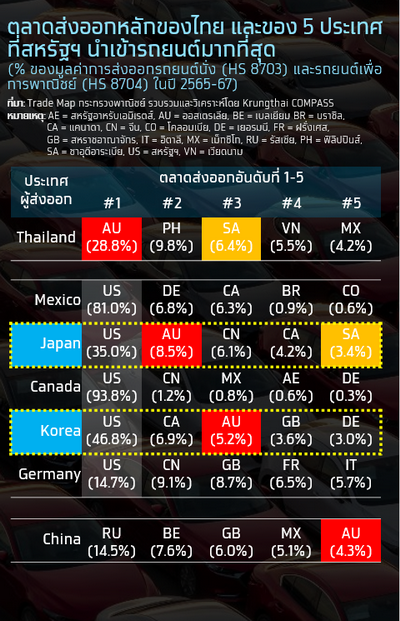 แต่หากในระยะถัดไป ทั้งสองประเทศเร่งขยายการส่งออกไปยังตลาดส่งออกอื่นเพื่อทดแทนตลาดสหรัฐฯ โดยมุ่งเป้าไปยังกลุ่มประเทศที่มีศักยภาพเติบโตอย่างซาอุดีอาระเบีย ฟิลิปปินส์ และเวียดนาม ซึ่งในช่วงปี 2562–67 มียอดขายรถยนต์เติบโตเฉลี่ยปีละ 8.6%, 2.7% และ 3.7% ตามลำดับ ก็อาจส่งผลกระทบต่อส่วนแบ่งตลาดส่งออกสำคัญของไทยได้เช่นกัน