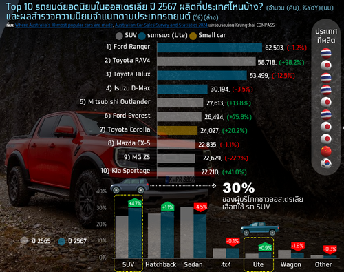 เมื่อพิจารณา 10 อันดับรถยนต์รุ่นยอดนิยมในออสเตรเลีย เป็นรถยนต์ที่ผลิตจากประเทศไทยและญี่ปุ่นประเทศละ 4 รุ่น ส่วนอีก 2 รุ่นที่เหลือผลิตจากจีนและเกาหลีใต้ โดยมีข้อสังเกตว่ามีรถยนต์ที่ผลิตจากญี่ปุ่น 3 จาก 4 รุ่น มียอดขายเติบโตขึ้นอย่างมีนัยสำคัญ ได้แก่ Toyota RAV4 (+98.2%YoY) Mitsubishi Outlander (+13.8%YoY) และ Toyota Corolla (+20.2%YoY) เช่นเดียวกับ Kia Sportage ที่ผลิตจากเกาหลีใต้ซึ่งมียอดขายเติบโต +41.0%YoY ในขณะที่รถยนต์ที่ผลิตจากไทย 3 ใน 4 รุ่นกลับมียอดขายหดตัว