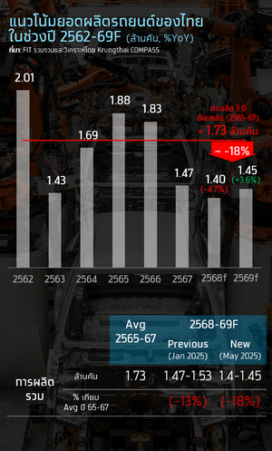 Krungthai COMPASS ปรับลดคาดการณ์ยอดการผลิตรถยนต์ไทยในปี 2568-69 ลงเหลือ 1.4-1.45 ล้านคัน อันเป็นผลมาจากสงครามการค้าที่ขยายวงกว้างมากขึ้น โดยเฉพาะการที่สหรัฐฯ ขึ้นภาษีศุลกากรรถยนต์และชิ้นส่วนฯ จากทุกประเทศ 25%