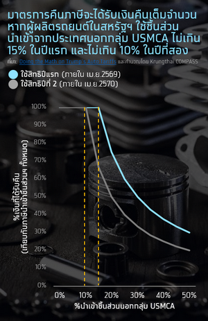 อย่างไรก็ดี สิทธิประโยชน์นี้จะได้รับเงินคืนเต็มจำนวนเฉพาะกรณีใช้ชิ้นส่วนฯ นำเข้าจากประเทศนอกกลุ่ม USMCA ไม่เกิน 15% ในปีแรก และไม่เกิน 10% ในปีที่สอง หากเกินกว่าระดับที่กำหนดจะได้รับเงินคืนบางส่วน17 จึงมีแนวโน้มที่ผู้ผลิตรถยนต์ในสหรัฐฯ จะลดระดับการนำเข้าจากประเทศนอกกลุ่ม USMCA รวมถึงไทย เพื่อลดภาระภาษีและรักษาสิทธิในการคืนภาษีเต็มจำนวน