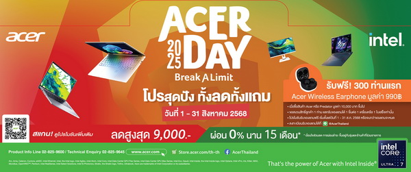 พร้อมกันนี้ เอเซอร์ยังมอบสิทธิพิเศษตลอดเดือนสิงหาคม 2568 เพื่อให้ทุกท่านได้ร่วมเฉลิมฉลอง Acer Day 2025 อย่างเต็มที่ กับแคมเปญ “โปรสุดปัง ทั้งลดทั้งแถม” ให้กับลูกค้าทั่วประเทศ ด้วยข้อเสนอสุดคุ้ม ดังนี้