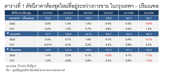 ศูนย์ข้อมูลอสังหาริมทรัพย์ (REIC) ธนาคารอาคารสงเคราะห์ (ธอส.) จัดทำบทวิเคราะห์ เรื่อง “ดัชนีราคาห้องชุดใหม่ที่อยู่ระหว่างการขาย ไตรมาสที่ 2 ปี 2568 ในกรุงเทพฯ – ปริมณฑล” พบว่า มีค่าดัชนีเท่ากับ 159.1 จุด เพิ่มขึ้นร้อยละ 1.4 เมื่อเทียบกับช่วงเดียวกันของปีก่อน (YoY) ปัจจัยหลักที่ผลักดันราคาห้องชุดให้ปรับตัวเพิ่มขึ้นมาจากต้นทุนการพัฒนาโครงการที่สูงขึ้น โดยเฉพาะต้นทุนก่อสร้าง ทั้งราคาวัสดุก่อสร้าง เช่น เหล็กเส้น ปูนซีเมนต์ กระจกอลูมิเนียม และค่าแรงงานที่ทยอยเพิ่มขึ้นตามสภาพเศรษฐกิจและค่าครองชีพ รวมถึงราคาที่ดินในทำเลศักยภาพ ซึ่งยังคงขยับขึ้นอย่างต่อเนื่อง โดยเฉพาะโครงการที่ตั้งอยู่ใกล้ระบบขนส่งมวลชน ศูนย์กลางธุรกิจ และพื้นที่ที่มีสิ่งอำนวยความสะดวกครบถ้วน ซึ่งล้วนเป็นทำเลที่ได้รับความนิยมจากทั้งผู้ซื้อเพื่ออยู่อาศัยจริงและนักลงทุน