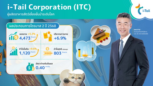 บริษัท ไอ-เทล คอร์ปอเรชั่น จำกัด (มหาชน) (ITC) ผู้นำระดับโลกในอุตสาหกรรมอาหารสัตว์เลี้ยง รายงานผลประกอบไตรมาส 2 ปี 2568 ด้วยยอดขาย 4,473 ล้านบาท เติบโต 5.3% จากไตรมาสก่อนหน้า ซึ่งเป็นผลมาจากปริมาณการขายที่เติบโต 6.9% ขับเคลื่อนด้วยคำสั่งซื้อจากกลุ่มลูกค้าผู้นำเข้าแบรนด์อาหารสัตว์เลี้ยงระดับโลก กำไรขั้นต้น 1,120 ล้านบาท โต 9.6% จากไตรมาสก่อนหน้า กำไรสุทธิปรับปรุงอยู่ที่ 803 ล้านบาท ทั้งนี้ บริษัทฯ ได้อนุมัติการจ่ายเงินปันผลระหว่างกาล 0.40 บาทต่อหุ้น โดยหุ้น ITC ถือเป็นหุ้นศักยภาพใน ดัชนี SET50 ที่จ่ายปันผลสูงในระดับดีต่อเนื่อง