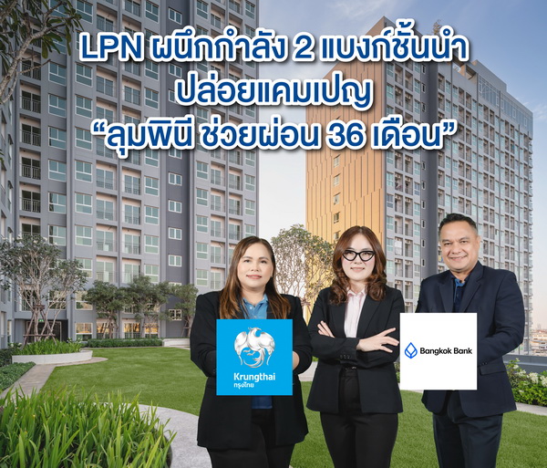 บริษัท แอล.พี.เอ็น.ดีเวลลอปเมนท์ จำกัด (มหาชน) จับมือ ธนาคารกรุงเทพ จำกัด (มหาชน) และ ธนาคารกรุงไทย จำกัด (มหาชน) จัดแคมเปญ “ลุมพินี ช่วยผ่อน 36 เดือน” แบ่งเบาภาระลูกค้า เพื่อสร้างโอกาสให้ทุกคนมีที่พักอาศัยที่มีคุณภาพ และส่งมอบประสบการณ์การอยู่อาศัย ผ่านการพัฒนาผลิตภัณฑ์และบริการที่ตอบรับทุกความต้องการด้วยประสบการณ์ในการดูแลลูกค้ากว่า 130,000 ครอบครัว มากว่า 36 ปี พร้อมมอบโปรโมชันสุดพิเศษจากธนาคาร ผ่อนสบายล้านละ 3,500 บาทต่อเดือน 3 ปีแรก* สำหรับลูกค้าที่จองและทำสัญญาซื้ออาคารชุดพักอาศัย ตั้งแต่วันนี้ ถึง 30 กันยายน 2568 สำหรับ 10 โครงการคอนโดฯคุณภาพทั้งในกรุงเทพฯและต่างจังหวัดที่เข้าร่วมแคมเปญ ได้แก่
