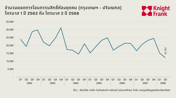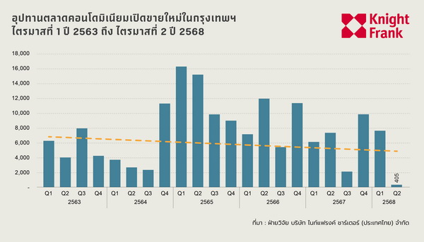 แนวโน้มของอุปทานแสดงทิศทางลดลงอย่างชัดเจน สะท้อนภาวะตลาดที่ยังมีความระมัดระวังของผู้พัฒนาในการเปิดตัวโครงการใหม่ของไตรมาส 2 ปี 2568 ต่ำสุดในรอบ 15 ปี โดยมีการเปิดตัวเพียง 405 ยูนิต ซึ่งตั้งอยู่ชานเมืองตอนเหนือของกรุงเทพฯ จากการเปิดตัวในไตรมาสนี้มีการเปิดตัวโครงการซึ่งต่ำที่สุดนับตั้งแต่ปี 2563 และลดลงอย่างมากจากค่าเฉลี่ยปกติในช่วงก่อนหน้า โดยเฉพาะช่วง Q2 ของปี 2565 ที่มีการเปิดตัวสูงสุดถึง 15,164 ยูนิต ซึ่งเป็นจุดสูงสุดในรอบ 5 ปี ก่อนเริ่มชะลอตัวลงอีกครั้งในปี 2566 ถึง 2568 และหลังจากไตรมาส 3 ของปี 2566 เป็นต้นมา โดยปริมาณหน่วยเปิดใหม่ต่อไตรมาสไม่เกิน 8,000 หน่วย และต่ำกว่า 3,000 หน่วย ในบางไตรมาส เช่น Q4 ของปี 2023 และ Q1 ของปี 2024 นอกจากนี้ ยอดการโอนกรรมสิทธิ์คอนโดมิเนียมในช่วง ไตรมาส Q2 ของปี 2568 ลดลงอย่างเห็นได้ชัด เหลือเพียง 12,183 หน่วย ซึ่งถือเป็นระดับต่ำที่สุดในรอบกว่า 6 ปี สะท้อนถึงภาวะตลาดที่ชะลอตัวรุนแรงต่อเนื่องจากความไม่แน่นอนทางเศรษฐกิจ และปัจจัยลบต่างๆ ที่ส่งผลกระทบต่อความเชื่อมั่นของผู้ซื้อ ทั้งภาระหนี้ครัวเรือนสูง ค่าใช้จ่ายยังเพิ่มขึ้น และความเข้มงวดของการปล่อยสินเชื่อจากสถาบันการเงิน