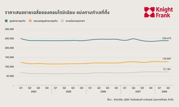 ในไตรมาสนี้ ราคาเสนอขายเฉลี่ยของคอนโดมิเนียมยังคงอยู่ในระดับทรงตัวโดยรวม สะท้อนถึงภาวะตลาดที่ยังไม่ฟื้นตัวอย่างเต็มที่ และการแข่งขันด้านราคาที่ยังคงสูงในหลายทำเล