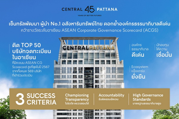 บริษัท เซ็นทรัลพัฒนา จำกัด (มหาชน) ผู้นำเบอร์หนึ่งอสังหาริมทรัพย์ไทยเพื่อความยั่งยืน ภายใต้วิสัยทัศน์ Imagining better futures for all เชื่อมโยงทุกธุรกิจทั้ง Retail-Residence-Hotel-Office คว้ารางวัลใหญ่ ASEAN Corporate Governance Scorecard (ACGS) ติดอับดับ TOP 50 บริษัทจดทะเบียนในอาเซียน ที่มีคะแนน ASEAN CG Scorecard สูงที่สุดในปี 2567 จากทั้งหมด 569 บริษัทที่เข้าร่วมประเมิน โดยมีเกณฑ์การพิจารณา 3 ข้อสำคัญ ได้แก่ 1. Championing Transparency โปร่งใส ตรวจสอบได้ 2. Accountability รับผิดชอบชัดเจน และ 3. High Governance Standards ธรรมาภิบาลสูงสุด จัดโดย Minority Shareholders Watch Group (MSWG) องค์กรที่มีความน่าเชื่อถือและมีบทบาทสำคัญด้านธรรมาภิบาลและความยั่งยืน ณ กรุงกัวลาลัมเปอร์ ประเทศมาเลเซีย