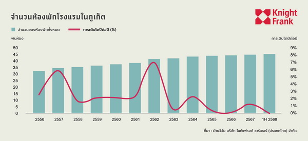 อุปทานโรงแรมเพิ่มขึ้นอย่างพอประมาณในครึ่งแรกของปี 2568 โดยมีโรงแรมใหม่ 2 แห่งรวม 376 ห้อง ได้แก่ Veranda Resort Phuket (Autograph Collection) และ Radisson Phuket Mai Khao ซึ่งอยู่ในกลุ่มอัพสเกลถึงอัพเปอร์อัพสเกล สำหรับครึ่งปีหลัง คาดว่าจะมีโรงแรมใหม่อีก 9 แห่ง รวม 1,758 ห้องเปิดให้บริการ ทำให้ตลอดปี 2568 จะมีอุปทานใหม่รวม 2,134 ห้อง ซึ่งถือเป็นการเพิ่มขึ้นอย่างมากเมื่อเทียบกับ 884 ห้องในปี 2567
