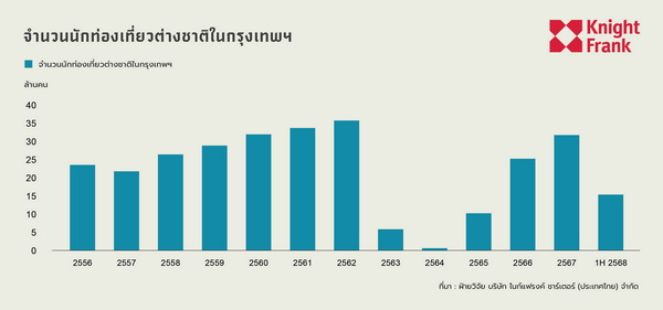 ในช่วงครึ่งแรกของปี 2568 ภาคการท่องเที่ยวของกรุงเทพฯ ยังคงฟื้นตัวอย่างต่อเนื่อง โดยมีนักท่องเที่ยวต่างชาติประมาณ 15.5 ล้านคน เพิ่มขึ้นเล็กน้อย 0.6% แบบปีต่อปี (YTD) อย่างไรก็ตาม ปริมาณนักท่องเที่ยวยังคงต่ำกว่าระดับสูงสุดในปี 2562 อยู่ 11.3% สะท้อนถึงผลกระทบที่ยังคงอยู่จากรูปแบบการท่องเที่ยวที่เปลี่ยนไป การท่องเที่ยวภายในประเทศมีผลการดำเนินงานที่ดีกว่า โดยมีจำนวนการเดินทางรวม 8.0 ล้านครั้ง เพิ่มขึ้น 7.3% แบบปีต่อปี แม้ว่ายังคงต่ำกว่าช่วงก่อนการแพร่ระบาดอยู่ 13% แม้จำนวนนักท่องเที่ยวจะทรงตัว แต่ผลการดำเนินงานของโรงแรมกลับอ่อนตัวลง: อัตราการเข้าพักเฉลี่ยลดลง 3.7 จุด อยู่ที่ 75% สาเหตุจากการเพิ่มขึ้นของอุปทานโรงแรม ระยะเวลาการเข้าพักเฉลี่ยที่สั้นลง และสัดส่วนนักท่องเที่ยวจากในภูมิภาคที่สูงขึ้น ซึ่งมีค่าใช้จ่ายต่อการเดินทางที่ต่ำกว่า