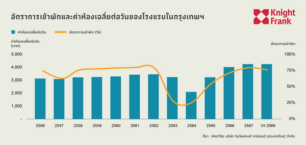 ตลาดโรงแรมกรุงเทพฯ มีการเปลี่ยนแปลงในทิศทางการฟื้นตัวในครึ่งแรกของปี 2568 อัตราการเข้าพักเฉลี่ยลดลงเหลือ 75.1% หรือลดลง 3.7 จุดจากช่วงเดียวกันของปีก่อน เดือนมกราคมและกุมภาพันธ์มีผลการดำเนินงานที่ค่อนข้างดี โดยอัตราการเข้าพักเกินกว่า 81% แต่ในเดือนต่อๆ มาอัตราการเข้าพักลดลงอย่างต่อเนื่อง จนถึงเดือนมิถุนายนซึ่งอยู่ที่ 69.8% ถือเป็นระดับที่ต่ำที่สุดในรอบกว่าหนึ่งปี แนวโน้มที่อ่อนตัวนี้สะท้อนถึงผลกระทบจากการเพิ่มขึ้นของจำนวนห้องพัก ระยะเวลาการเข้าพักที่สั้นลง และการพึ่งพาตลาดระยะใกล้ที่มีศักยภาพด้านผลตอบแทนต่ำกว่า