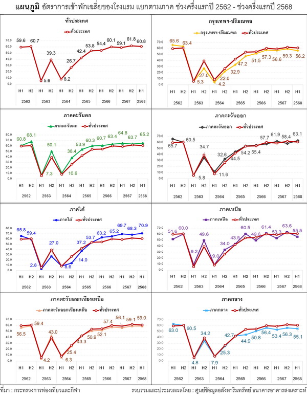 ณ ครึ่งแรกปี 2568 อัตราการเข้าพักเฉลี่ยของโรงแรมทั่วประเทศอยู่ที่ร้อยละ 60.8 เพิ่มขึ้นเมื่อเทียบกับช่วงเดียวกันของปีก่อน (YoY) ที่มีอัตราการเข้าพักเฉลี่ยอยู่ที่ร้อยละ 59.1 เมื่อแบ่งเป็นรายภาค พบว่า ภาคใต้มีอัตราการเข้าพักเฉลี่ยมากที่สุดร้อยละ 70.9 รองลงมา ได้แก่ ภาคตะวันตกร้อยละ 65.2 ภาคตะวันออกร้อยละ 63.1 ภาคตะวันออกเฉียงเหนือร้อยละ 59.0 กรุงเทพฯ – ปริมณฑล ร้อยละ 56.2 ภาคเหนือร้อยละ 55.5 และภาคกลางร้อยละ 55.1 ตามลำดับ ซึ่งเกือบทุกภาคมีอัตราการเข้าพักเฉลี่ยเพิ่มขึ้น อย่างไรก็ตาม มีเพียงกรุงเทพฯ – ปริมณฑลที่มีอัตราการเข้าพักเฉลี่ยลดลงร้อยละ -0.7 สะท้อนว่า อุปสงค์หรือจำนวนผู้เข้าพัก ลดลงสวนทางกับจำนวนห้องพักสะสมที่เพิ่มขึ้นในกรุงเทพฯ-ปริมณฑล ส่งผลให้การแข่งขันในตลาดที่พักของกรุงเทพฯ และปริมณฑลสูงขึ้น และเป็นความท้าทายที่ผู้ประกอบการต้องวางแผนและปรับกลยุทธ์เพื่อรับมือกับความเสี่ยงจากภาวะอุปทานส่วนเกิน