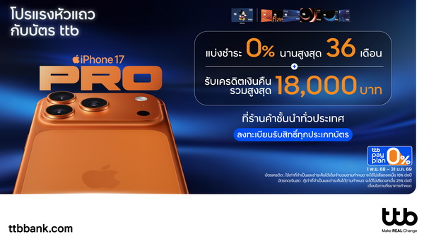 โดยล่าสุดทีทีบีมอบสิทธิพิเศษสำหรับผู้ถือบัตรเครดิต ttb บัตรเครดิต ttb Global House บัตรเครดิต ttb Disney และบัตรกดเงินสด ttb เมื่อซื้อ iPhone 17 ทุกรุ่นที่ร่วมรายการ รับสิทธิ์แบ่งชำระ 0% นานสูงสุด 36 เดือน พร้อมรับเครดิตเงินคืนรวมสูงสุด 18,000 บาท เมื่อมียอดแบ่งชำระตั้งแต่ 30,000 บาทขึ้นไป / เซลล์สลิป และยังสามารถแลกคะแนนรับเครดิตเงินคืนสูงสุดถึง 15% เมื่อใช้คะแนนสะสมทุก 1,000 คะแนน และมียอดแบ่งชำระ 0% ตั้งแต่วันที่ 1 พฤศจิกายน 2568 – 31 มกราคม 2569 เพื่อยกระดับประสบการณ์การผ่อนชำระให้คุ้มค่ายิ่งขึ้นกับร้านค้าพาร์ทเนอร์ชั้นนำทั่วประเทศ ศึกษารายละเอียดเพิ่มเติมของโปรโมชัน ได้ที่ https://www.ttbbank.com/th/promotion/credit-card/zero-pay-plan/ip17-nov25