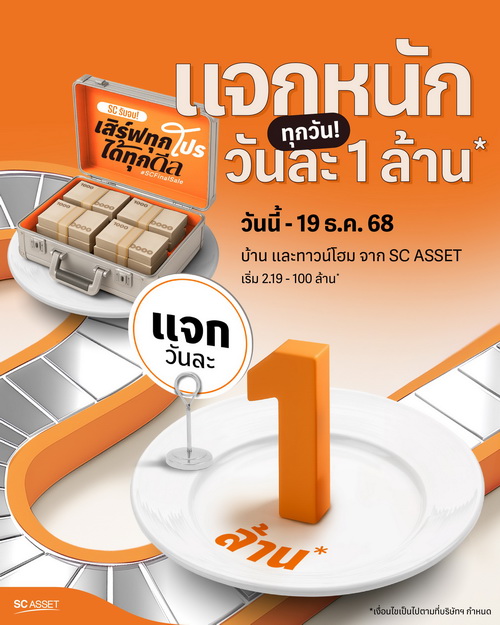 เอสซี แอสเสท ผู้นำตลาดที่อยู่อาศัยระดับพรีเมียม เดินหน้าเขย่าตลาดอสังหาฯ ช่วงโค้งสุดท้ายของปี ด้วยการเปิดตัวแคมเปญใหญ่ “SC Final Sale” มอบข้อเสนอที่แรงที่สุดแห่งปี แจกหนักทุกวัน วันละ 1 ล้านบาท ตั้งแต่วันนี้ – 19 ธันวาคม 2568 เท่านั้น พร้อมเสิร์ฟดีลพิเศษแบบ “เอสซีรับจบ” ให้ลูกค้าได้ทุกโปร ทุกดีลแบบไม่มีกั๊ก ครอบคลุมบ้านเดี่ยว และ ทาวน์โฮม โครงการคุณภาพในทุกเซกเมนต์ของบริษัท