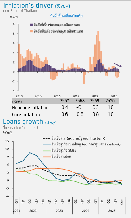 เศรษฐกิจไทยมีแนวโน้มการเติบโตที่ชะลอตัวอย่างชัดเจน และมีความเสี่ยงที่มากขึ้น โดย กนง. คาดว่าเศรษฐกิจจะขยายตัวชะลอลงจากการบริโภคที่แผ่วลงตามแนวโน้มรายได้ที่ขยายตัวต่ำ โดยเฉพาะในภาคการผลิต และผลกระทบของ US tariff ที่จะทยอยเพิ่มขึ้น อีกทั้งผลของสถานการณ์อุทกภัยในพื้นที่ภาคใต้ที่ส่งผลกระทบต่อกิจกรรมทางเศรษฐกิจ โดยเฉพาะในภาคบริการ ซึ่งผลกระทบนี้คาดว่าจะต่อเนื่องไปจนถึงไตรมาสแรกของปี 2569 โดยรวมทำให้เกิดความเสี่ยงเพิ่มเติมต่อ SMEs และครัวเรือนในกลุ่มเปราะบาง ขณะที่แนวโน้มการท่องเที่ยวคาดว่าจะทยอยฟื้นตัวอย่างช้าๆ