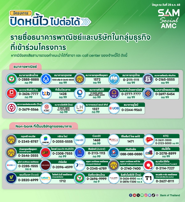นางสาวนารถนารี รัฐปัตย์ กรรมการผู้จัดการ บริษัทบริหารสินทรัพย์สุขุมวิท จำกัด (SAM) เปิดเผยว่า ภายหลังการเปิดรับสมัครโครงการ “ปิดหนี้ไว ไปต่อได้” อย่างเป็นทางการตั้งแต่วันที่ 5 มกราคม 2569 เพื่อช่วยเหลือลูกหนี้รายย่อยประเภทบุคคลธรรมดา ที่เป็นหนี้เสียแบบไม่มีหลักประกัน เช่น บัตรเครดิต สินเชื่อส่วนบุคคล และติ่งหนี้ของหนี้ที่เคยมีหลักประกัน เกินกว่า 90 วัน (NPLs) ณ วันที่ 30 กันยายน 2568 โดยมีภาระหนี้เงินต้นและดอกเบี้ยรวมกันไม่เกิน 100,000 บาท ให้สามารถเข้าสู่กระบวนการปรับโครงสร้างหนี้อย่างเป็นระบบ โดยพบว่าเพียง 3 วันแรกของการเปิดรับสมัคร มีผู้สนใจลงทะเบียนเข้าร่วมโครงการผ่านทางเว็บไซต์ธนาคารแห่งประเทศไทย www.bot.or.th และ www.sam.or.th รวมทั้งสิ้นเกือบ 90,000 ราย