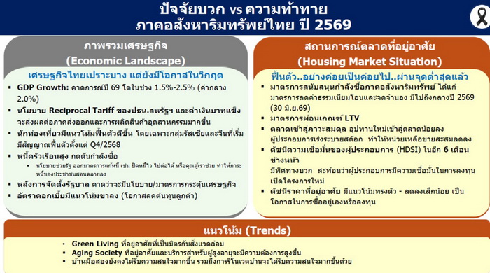 สำหรับแนวโน้มสถานการณ์ตลาดที่อยู่อาศัยปี 2569 เศรษฐกิจไทยเปราะบาง ขึ้นอยู่กับว่าใครจะมองหาโอกาสได้ โดยคาดการณ์ GDP Growth ในปี 2569 จะขยายตัวอยู่ในช่วง 1.5-2.5 (ค่ากลาง 2.0) ระดับหนี้ครัวเรือนยังคงอยู่ในระดับสูง กดดันกำลังซื้อ อย่างไรก็ตาม ภาครัฐมีนโยบายกระตุ้นเศรษฐกิจในระยะสั้น (Quick Big Win) ในการช่วยแก้ปัญหาหนี้ครัวเรือน เช่น ปิดหนี้ไว ไปต่อได้ หรือคุณสู้เราช่วย ทำให้ภาระหนี้ของประชาชนผ่อนคลายลง อัตราดอกเบี้ยมีแนวโน้มขาลง จำนวนและรายได้จากนักท่องเที่ยวมีแนวโน้มฟื้นตัวดีขึ้น