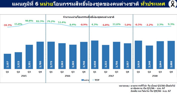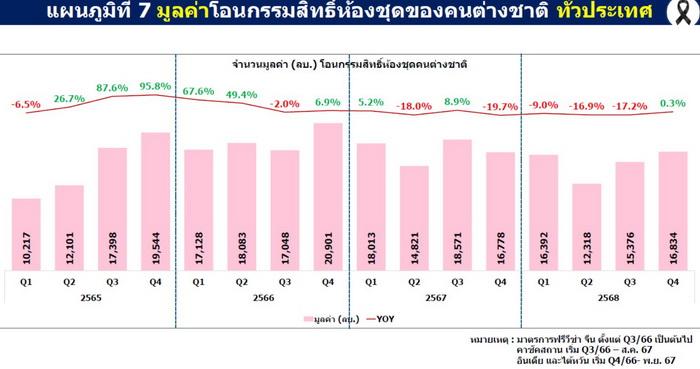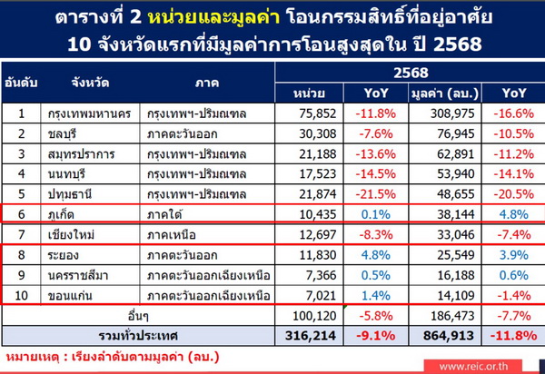 อย่างไรก็ตาม เมื่อพิจารณาในรายพื้นที่ พบว่า 10 จังหวัดแรก ที่มีมูลค่าการโอนสูงสุด ในไตรมาส 4 ปี 2568 ประกอบด้วย กรุงเทพมหานคร ชลบุรี สมุทรปราการ นนทบุรี ปทุมธานี ภูเก็ต เชียงใหม่ ระยอง ขอนแก่น และนครราชสีมา มีจังหวัดที่มีการขยายตัวของการโอนเพิ่มขึ้นจากไตรมาสเดียวกันของปีก่อน (YoY) ทั้งจำนวนหน่วย และมูลค่าในไตรมาส 4 ได้แก่ ขอนแก่น และระยอง มีหน่วยการโอนกรรมสิทธิ์เพิ่มขึ้นเช่นกัน แต่หากพิจารณา 10 จังหวัดที่มีมูลค่าโอนสูงสุดในปี 2568 ประกอบด้วย กรุงเทพมหานคร ชลบุรี สมุทรปราการ นนทบุรี ปทุมธานี ภูเก็ต เชียงใหม่ ระยอง นครราชสีมา และขอนแก่น พบว่ามีจังหวัดที่มีการขยายตัวของการโอนเพิ่มขึ้นจากไตรมาสเดียวกันของปีก่อน (YoY) ทั้งจำนวนหน่วยและมูลค่า ได้แก่ ภูเก็ต ระยอง และนครราชสีมา แต่พบว่า จังหวัดขอนแก่น มีหน่วยโอนเพิ่มแต่มูลค่าลดลง