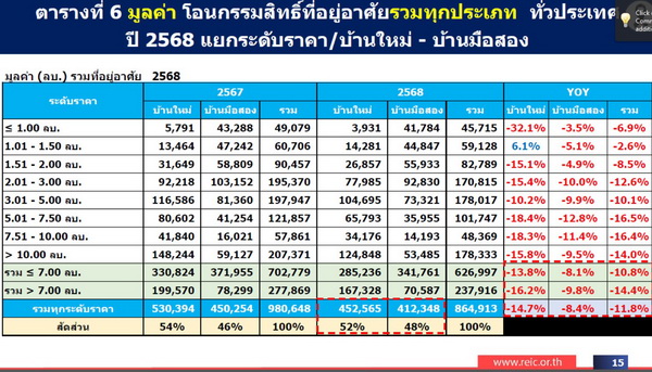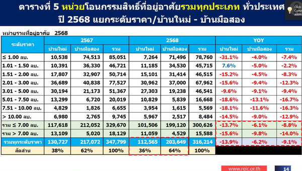 อย่างไรก็ตาม กล่าวโดยสรุป ปี 2568 เป็นปีที่ตลาดที่อยู่อาศัยไทยปรับตัวลดลงทั้งในด้านจำนวนหน่วยและมูลค่า แม้ไตรมาสสุดท้ายจะเริ่มฟื้นตัวจากมาตรการ Quick Big Win และมาตรการลดค่าธรรมเนียมการโอนและจดจำนอง มาตรการผ่อนคลายเกณฑ์ LTV แต่การฟื้นตัวยังมีลักษณะจำกัด ขณะที่ ปี 2569 เศรษฐกิจมีแนวโน้มทรงตัว ซึ่งเป็นช่วงของการปรับสมดุลเชิงโครงสร้างระหว่างอุปสงค์ อุปทาน และภาวะสินเชื่อภายในประเทศ ซึ่งคาดการณ์ว่าจะส่งผลบวกต่อภาคอสังหาริมทรัพย์และภาพรวมเศรษฐกิจไทยให้ขยายตัวดีขึ้น