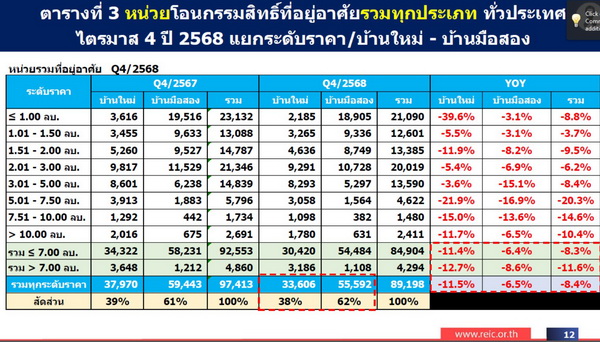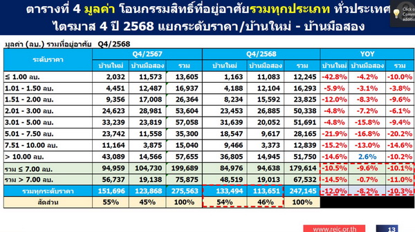 นายณรงค์พล ประภานิรินธน์ รองกรรมการผู้จัดการ กลุ่มงานการตลาด รักษาการผู้อำนวยการศูนย์ข้อมูลอสังหาริมทรัพย์ (REIC) เปิดเผยว่า สถานการณ์ตลาดที่อยู่อาศัยในภาพรวมของไตรมาส 4 ปี 2568 เริ่มเห็นสัญญาณการฟื้นตัวต่อเนื่องจาก 2 ไตรมาสที่ผ่านมา โดยอุปสงค์ขยายตัวเพิ่มขึ้นในไตรมาส 4 เมื่อเทียบกับไตรมาส 3 (QoQ) จากแรงสนับสนุนของมาตรการลดค่าธรรมเนียมการโอนและจดจำนอง และการผ่อนคลายเกณฑ์ LTV ที่ช่วยกระตุ้นการตัดสินใจซื้อเพื่ออยู่อาศัยจริง ส่งผลให้จำนวนการโอนกรรมสิทธิ์ที่อยู่อาศัยทั่วประเทศในไตรมาส 4 เพิ่มขึ้นจากไตรมาส 3 (QoQ) ทั้งจำนวนหน่วยและมูลค่า โดยจำนวนหน่วยอยู่ที่ 89,198 หน่วย เพิ่มขึ้น 4,801 หน่วย จาก 84,397 หน่วย ในไตรมาส 3 คิดเป็นเพิ่มขึ้น 5.7% (QoQ) ขณะที่มูลค่าการโอนอยู่ที่ 247,145 ล้านบาท เพิ่มขึ้น 20,979 ล้านบาท จาก 226,166 ล้านบาท คิดเป็นเพิ่มขึ้น 9.3% (QoQ) เมื่อพิจารณาแยกตามประเภทอสังหาริมทรัพย์ พบว่า ที่อยู่อาศัยแนวราบจำนวน 60,086 หน่วย เพิ่มขึ้น 4.4% (QoQ) มีมูลค่า 174,469 ล้านบาท เพิ่มขึ้น 6.3% (QoQ) ขณะที่อาคารชุดมีการโอน 29,112 หน่วย เพิ่มขึ้น 8.6% (QoQ) และมูลค่า 72,677 ล้านบาท เพิ่มขึ้น 17.0% (QoQ)