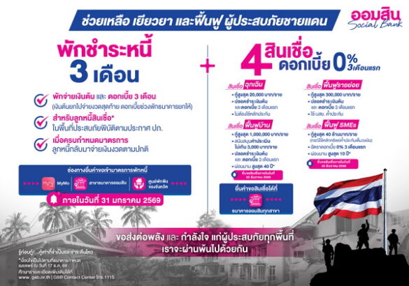 สินเชื่อพิเศษ ดอกเบี้ย 0% ใน 3 เดือนแรก พร้อมจัดงบช่วยเหลือเฉพาะหน้าและงบเยียวยาครอบครัวผู้เสียชีวิต นางลภาวรรณ จันทร์กระจ่าง รองผู้อำนวยการธนาคารออมสิน…