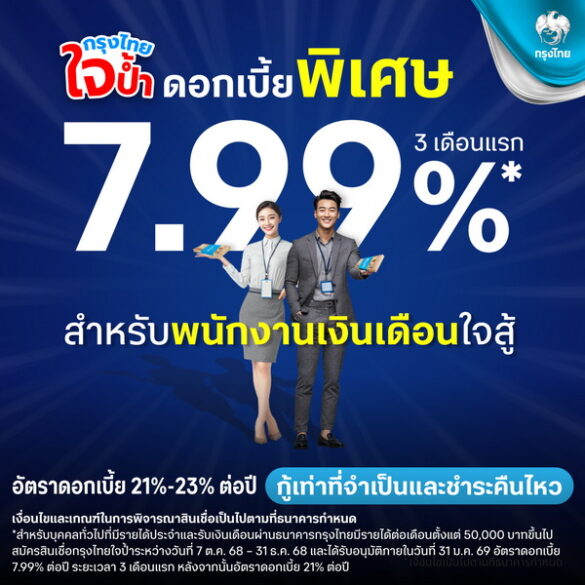ธนาคารกรุงไทยมุ่งสนับสนุนการเข้าถึงสินเชื่อของประชาชน และเป็นส่วนหนึ่งของการช่วยลดภาระให้แก่มนุษย์เงินเดือน มอบอัตราดอกเบี้ยพิเศษของ “กรุงไทยใจป้ำ” สินเชื่อเงินสู้ ต่ำสุดเริ่มต้นเพียง 7.99%* ต่อปี นาน 3…
